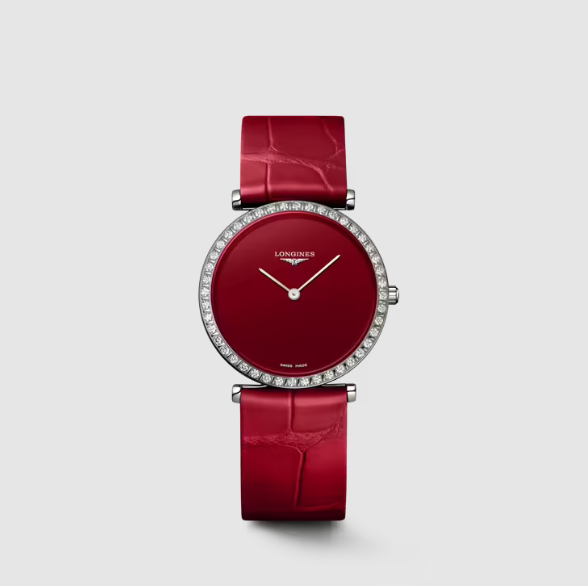 في تجسيد للبساطة والفخامة الكلاسيكية، تأتي ساعة La Grande Classique de Longines لتعكس براعة دار لونجين في تصميم ساعات راقية تجمع بين الجمال والدقة. تتميز هذه الساعة بعلبة دائرية أنيقة بقطر 29 ملم، مصنوعة من الفولاذ المقاوم للصدأ ومرصعة بـ 44 حجر ألماس من فئة Top Wesselton IF-VVS، بوزن إجمالي 0.369 قيراط. الإطار الألماسي يضفي بريقًا أنيقًا يزيد من جاذبية التصميم الرقيق. يعكس الميناء المطلي باللون الأحمر اللامع روح الجرأة والرقي، بينما تتحرك عليه عقارب فضية مصقولة بانسيابية، لتُشير إلى الساعات والدقائق بدقة بفضل حركة الكوارتز Caliber L420 الموثوقة. ويكتمل هذا التصميم بمقاومة للماء تصل إلى 3 بار (30 مترًا)، مع زجاج كريستالي من الياقوت المقاوم للخدوش، مما يحافظ على رونق الساعة لفترة طويلة. السوار المصنوع من جلد التمساح الأحمر ينسجم بانسيابية مع تصميم الساعة، ويُغلق بمشبك تقليدي يعزز من راحة الارتداء. أما نحافة العلبة التي تبلغ 4.50 ملم فقط، فتُبرز الطابع الكلاسيكي للساعات ذات الخطوط الأنيقة، ما يجعلها قطعة مثالية لإطلالة راقية تنضح بالتفرد والجاذبية.