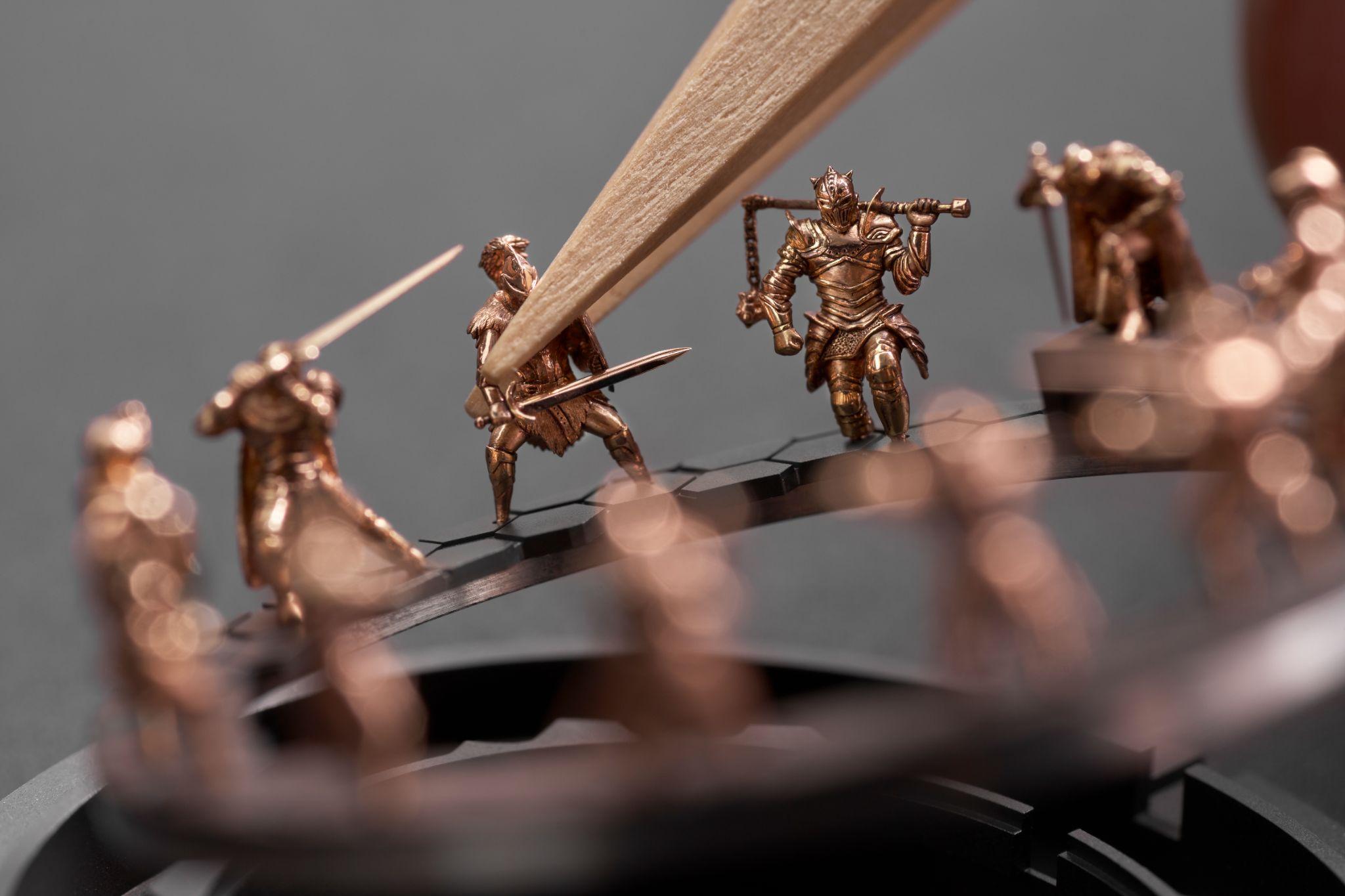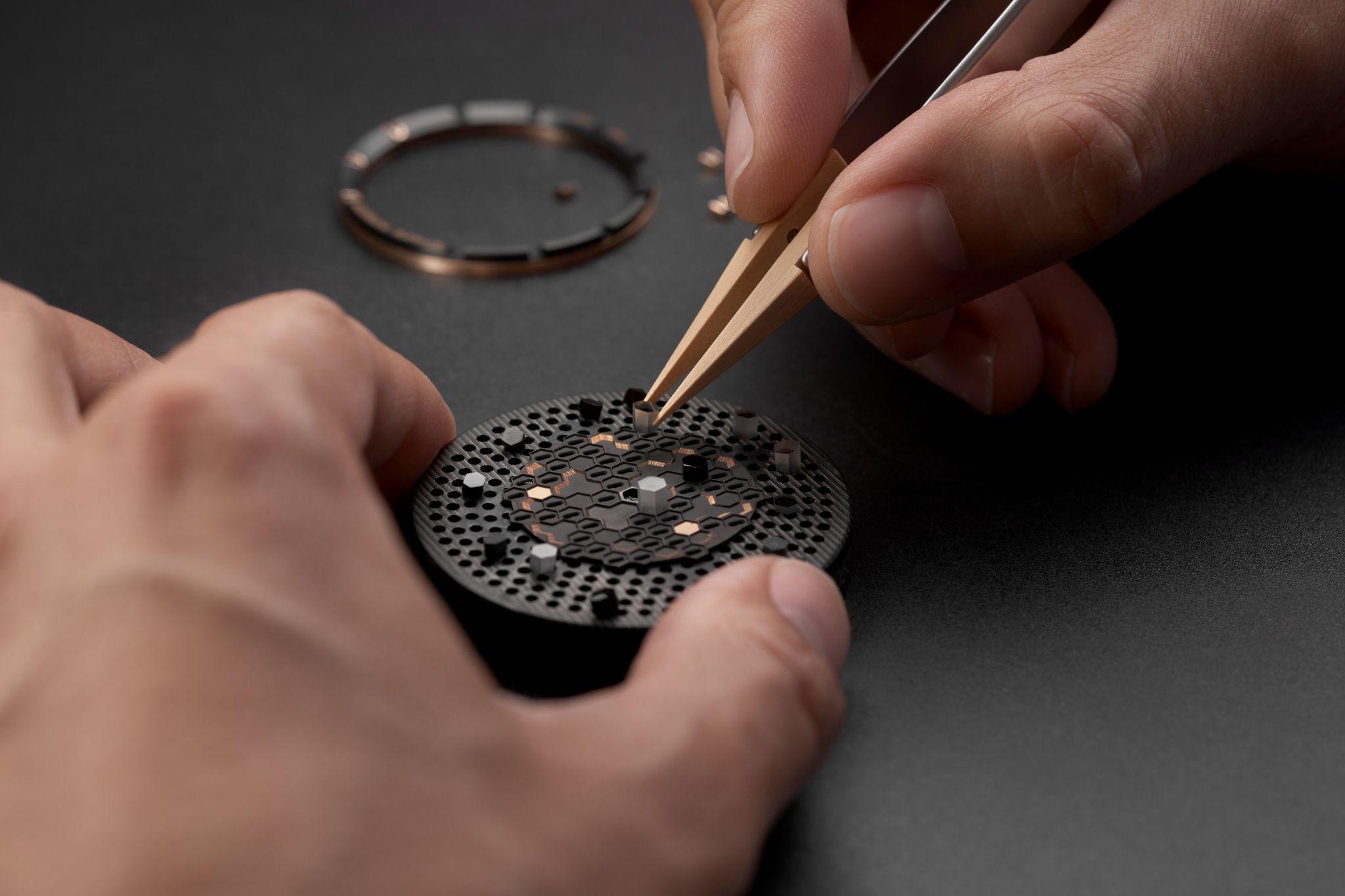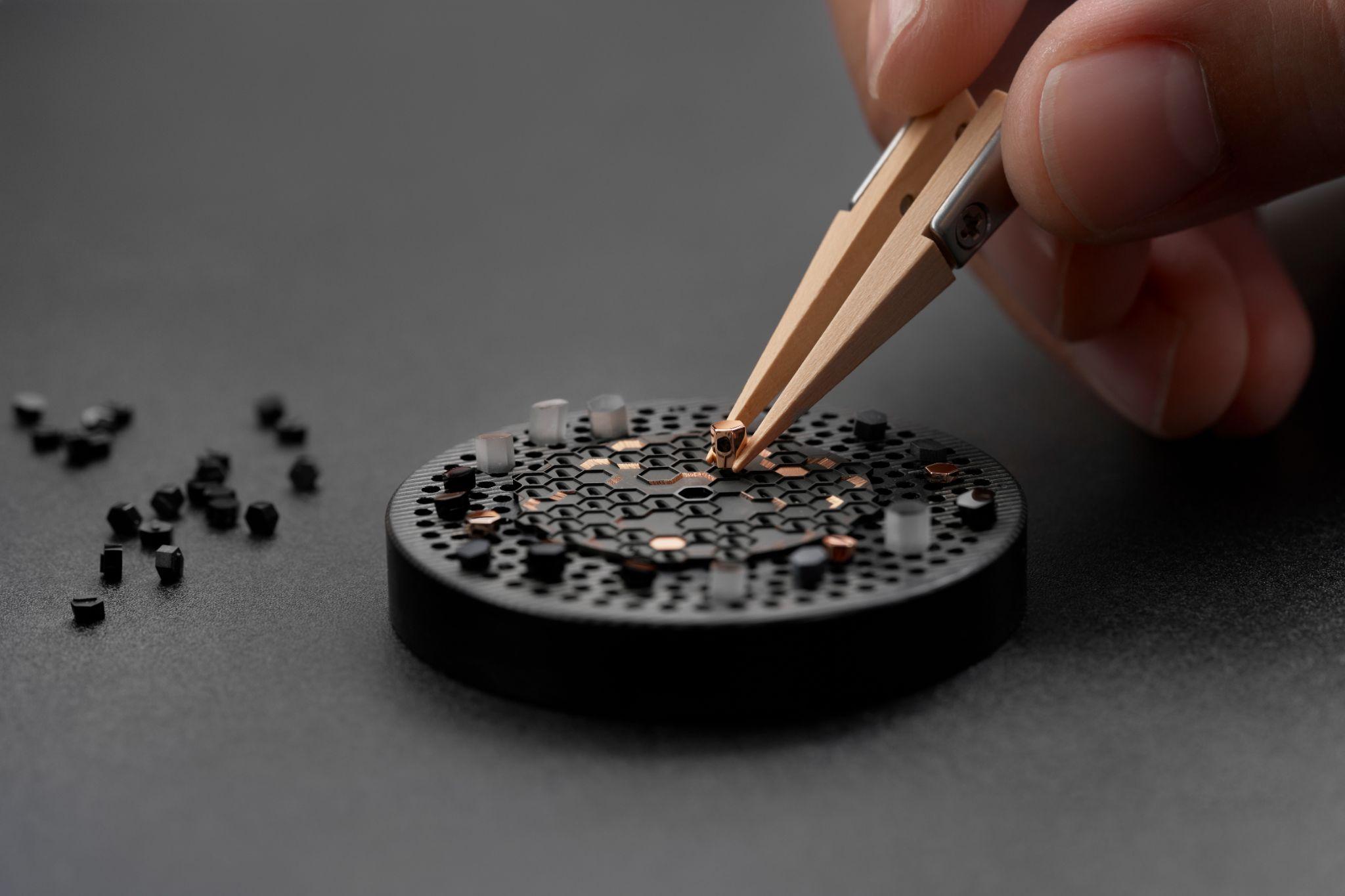 وقد زُودت العلبة بغطاء خلفي من زجاج الكريستال الياقوتي يكشف عن آلية الحركة الداخلية بتفاصيلها المبهرة. تحيط بالميناء حلية من الألماس المتلألئ، في حين تزين القرنين زخرفة على شكل “سنوفلايك”، حيث تم ترصيع الأحجار الكريمة بأحجام متباينة لتمنح الساعة تألقًا أشبه بلمعان الثلج تحت أشعة الشمس. أما التاج فهو غير لولبي، ومرصّع بحجر ياقوت كابوشون أحمر يضفي لمسة من الفخامة والرقي. يأتي الميناء مصنوعًا من عرق اللؤلؤ الطبيعي، ينساب عليه الضوء والظل بتناغم أخاذ. وقد زُينت الحافة الداخلية بتدرج من أحجار الياقوت الوردي المتلألئ الذي يلتقي عند قلب من الياقوت الأحمر بين الساعتين 6 و9، ليكون رمزًا دائمًا للحب والعاطفة. أما العقارب الفولاذية الزرقاء ذات التصميم المفتوح، فهي تتحرك بانسيابية فوق الميناء، مشيرة إلى لحظات تستحق الاحتفاء بها. تُدار هذه الساعة بواسطة الحركة الأوتوماتيكية Calibre 537/3، التي تتميز باحتياطي طاقة يصل إلى 45 ساعة. تضم الحركة 191 مكونًا، مع 26 حجرًا كريماً، وتعمل بتردد 3.5 هرتز، مما يضمن دقة وثبات الأداء. كما يحتوي نظام الحركة على زنبرك توازن ورافعة مصنوعة من السيليكون لضمان مقاومة أكبر للتآكل والعوامل الخارجية. يكتمل التصميم بسوار مصنوع من جلد التمساح الأحمر الفاخر، يُغلق بمشبك ثلاثي من الذهب الأبيض عيار 18 قيراطًا، مما يوفر الراحة والأناقة في آن واحد. وتتمتع الساعة بمقاومة للماء تصل إلى 3 بار (30 مترًا)، مما يعزز من وظيفيتها وعمليتها.