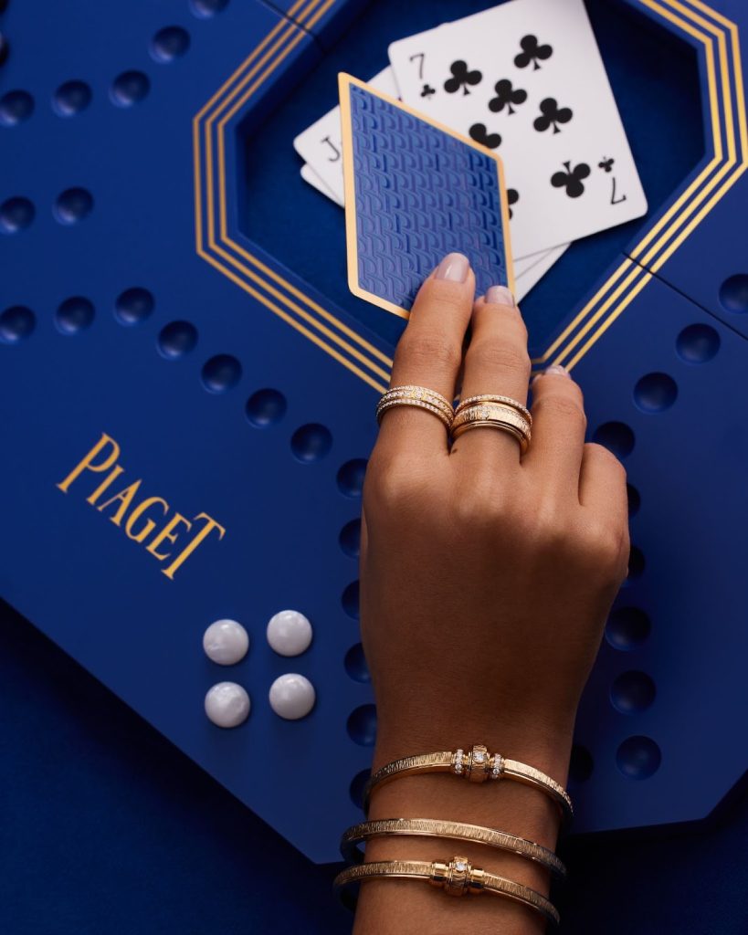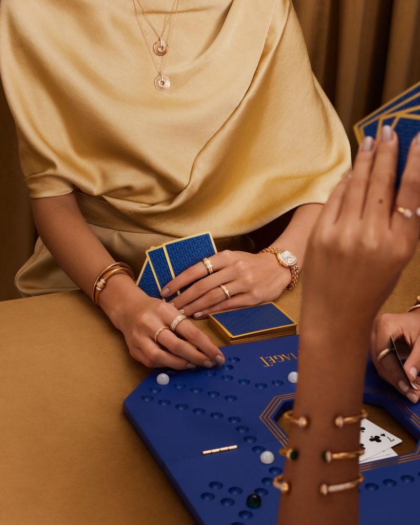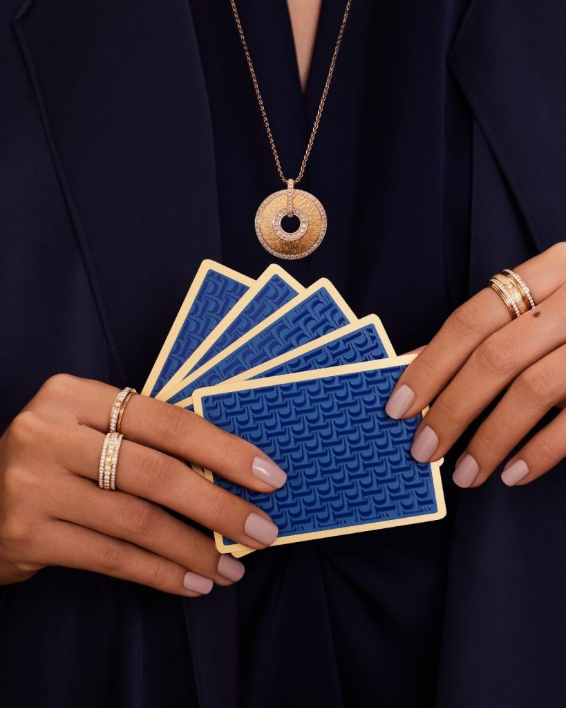في هذه الحملة من Piaget، لا تظهر المجوهرات والساعات كعناصر منفصلة عن المشهد، بل كجزءٍ حيّ من طقس رمضاني مألوف: أوراق لعب زرقاء بحواف ذهبية، رقعة طاولة الزهر بخشبها الدافئ، وقطع شطرنج مصطفّة بعناية. الأزرق الملكي العميق يلتقي ببريق الذهب في تباين بصري مدروس يعكس فلسفة الدار القائمة على الضوء والملمس والحركة.