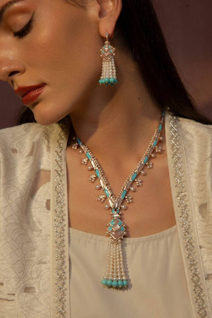 تتميّز التصاميم بخطوط نحتية لافتة، تتداخل فيها طبقات التوهّج الناعم للؤلؤ مع لوحة غنيّة من الأحجار الكريمة المنتقاة يدوياً. من الأعماق الهادئة للفيروز والأوبال، إلى الألوان المتألقة للجمشت والتورمالين، تنسج المجموعة حواراً بصرياً بين الضوء واللون، بين النعومة والقوة. وتستمد هذه القطع هويتها الجمالية من الهندسة العربية والخطوط الانسيابية لأسلوب Arab Deco، حيث يتحوّل الإرث إلى بيانٍ جريءٍ ومُعاصر. إنها تصاميم لافتة، نابضة بالحياة، ومشعّة بخفّة آسرة، ما يجعلها مثالية لتجمّعات الإفطار، وأمسيات السحور، وهدايا العيد ذات المعنى العميق. كل قطعة صُمّمت لتُرتدى، وتُحسّ، وتُخلَّد في الذاكرة.