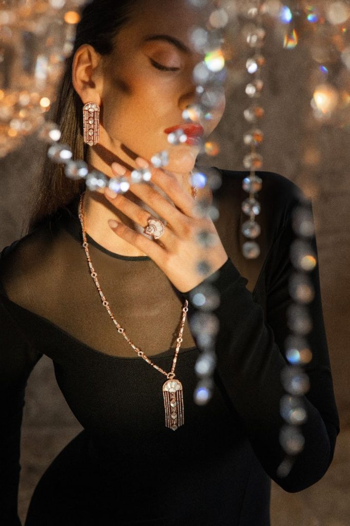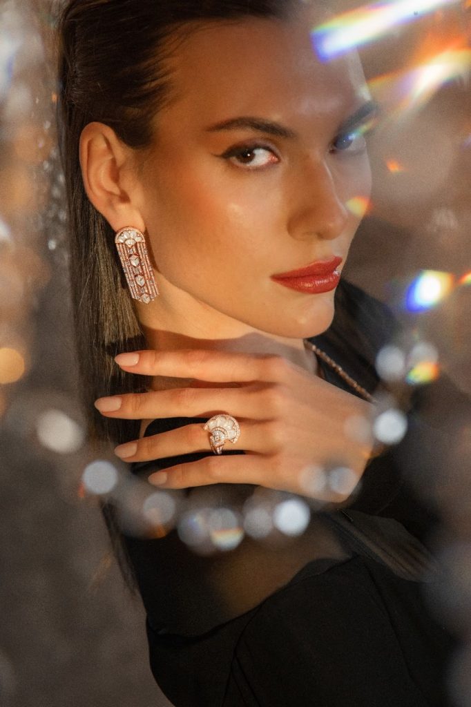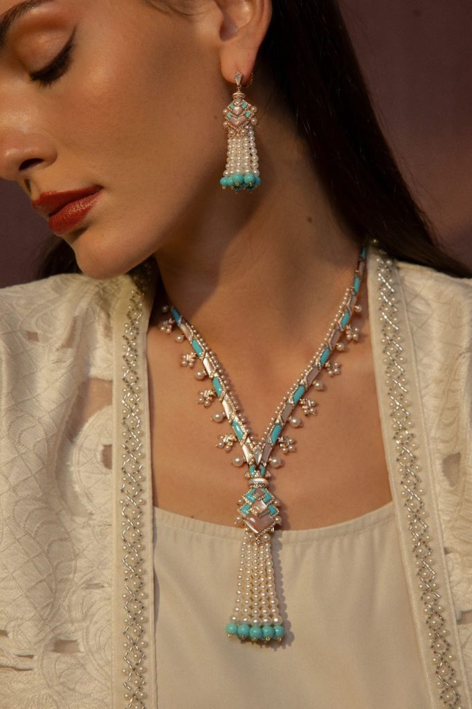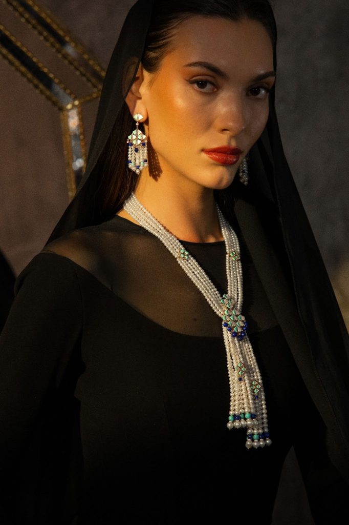 تتميّز التصاميم بخطوط نحتية لافتة، تتداخل فيها طبقات التوهّج الناعم للؤلؤ مع لوحة غنيّة من الأحجار الكريمة المنتقاة يدوياً. من الأعماق الهادئة للفيروز والأوبال، إلى الألوان المتألقة للجمشت والتورمالين، تنسج المجموعة حواراً بصرياً بين الضوء واللون، بين النعومة والقوة. وتستمد هذه القطع هويتها الجمالية من الهندسة العربية والخطوط الانسيابية لأسلوب Arab Deco، حيث يتحوّل الإرث إلى بيانٍ جريءٍ ومُعاصر. إنها تصاميم لافتة، نابضة بالحياة، ومشعّة بخفّة آسرة، ما يجعلها مثالية لتجمّعات الإفطار، وأمسيات السحور، وهدايا العيد ذات المعنى العميق. كل قطعة صُمّمت لتُرتدى، وتُحسّ، وتُخلَّد في الذاكرة.