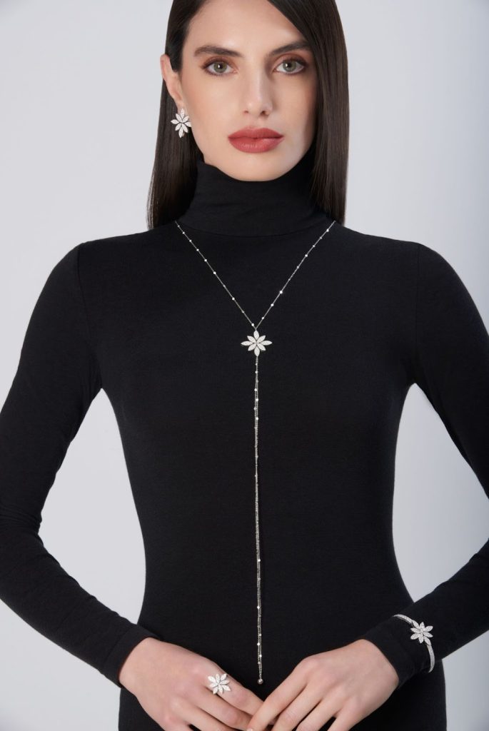 تُعد مجموعة Rosina من أبرز مجموعات المجوهرات الراقية لدى الدار، وتحمل في جوهرها قصة شخصية وعائلية عميقة. صمّمتها المديرة الإبداعية يوجينيا بروني تكريمًا لمسيرة عائلتها، مستلهمة رؤيتها من عمّتها روزينا، المرأة التي تركت أثرًا إنسانيًا خالدًا بفضل دفئها، كرمها، وصلابتها. في هذه المجموعة، تُعاد صياغة الوردة لتصبح ماندالا سماوية، قلب التصميم النابض، ورمزًا للانسجام بين الأرض والسماء، وبين الجسد والروح. كل بتلة مصنوعة من الذهب الأبيض عيار 18 قيراطًا، مرصّعة بالألماس الأبيض، فتتألّق مع الحركة كأنها تذوب في الضوء، مستحضرة إيقاع نبض القلب.