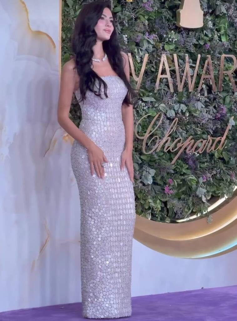 نور الغندور بدورها تألّقت بمجوهرات راقية من دار Annabelle، حيث اختارت عقداً من الذهب الأبيض مرصّعاً بألماس بتقطيع الكمثرى على امتداد السلسلة، تصطفّ أحجاره بتناغم هندسي يمنح إشراقة ناعمة لخطّ العنق، ويتدلّى منه حجر مركزي بتقطيع Princess Cut يضيف لمسة عصرية وبريقاً لافتاً.