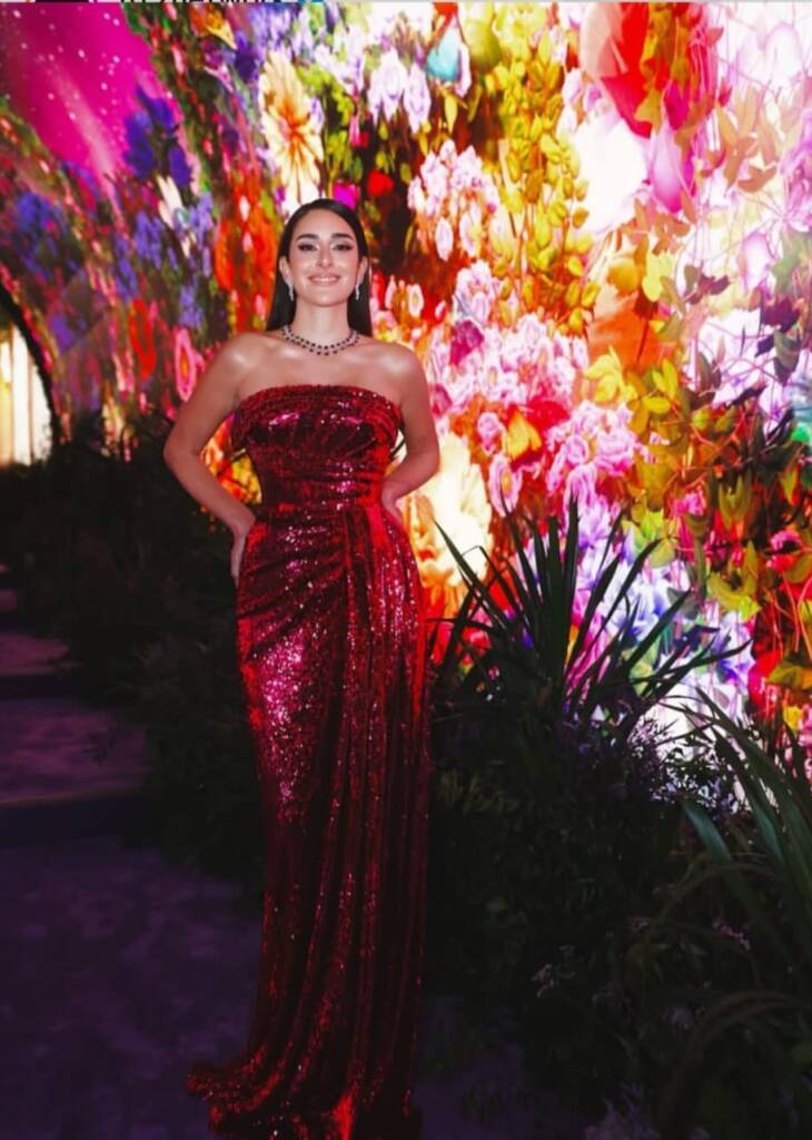 أمينة خليل أشرقت بطقم High Jewelry من شوبارد، بعقد مؤلّف من صفّين من أحجار الروبي بتقطيع دائري تتخلّلهما فواصل من الألماس الأبيض، تتوسّطه أحجار ألماس أكبر بتقطيع البريليانت، مع أقراط متدلّية مرصّعة بالكامل بالألماس بتقطيعات بريليانت وماركيز، في تناغم يبرز إشراقة الوجه.