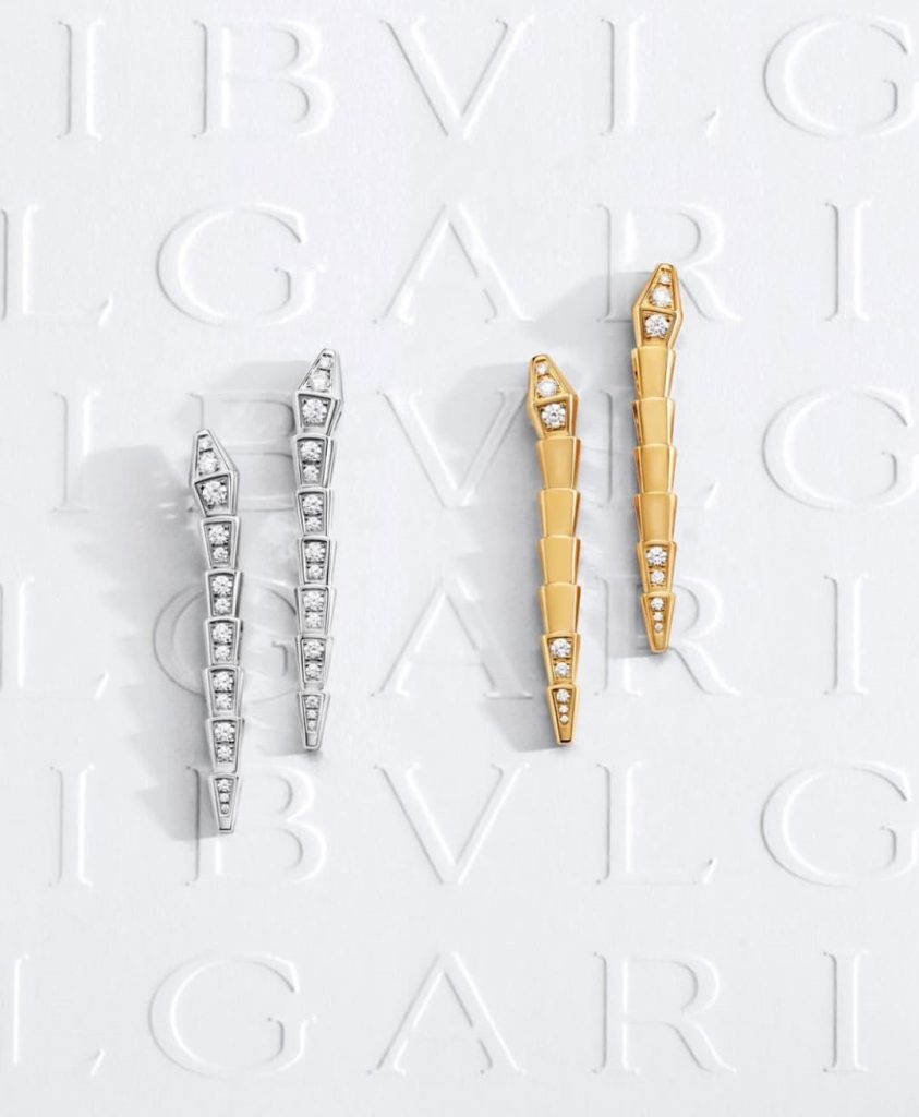 وفي عالم الأقراط، تعتمد بولغري على الخطوط العمودية الانسيابية التي تستلهم شكل الأفعى المتحرّكة، حيث يلتقي الذهب الثمين بلمسات الألماس في تصميم خفيف، عصري، ويمنح الوجه إشراقة أنيقة من دون مبالغة.
