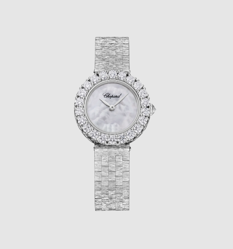 تجسّد ساعة L’Heure du Diamant Round من دار Chopard براعة الدار في أسر جمال الألماس وإبراز أنوثته الراقية. تأتي هذه التحفة الفاخرة بعلبةٍ دائرية قطرها 26 ملم وسماكة 9 ملم، مصنوعة من الذهب الأبيض عيار 18 قيراط، ومرصّعة بـ 2.23 قيراط من الألماس الأبيض الذي يعكس الضوء بانسيابية آسرة. تعمل الساعة بحركة يدوية التعبئة دقيقة الأداء، وتُظهر الساعات والدقائق فقط في بساطةٍ أنيقة تحاكي روح المجوهرات الراقية. أما التاج والمشبك المطوي فمصنوعان من الذهب الأبيض عيار 18 قيراط، ما يمنحها مظهراً متجانساً في كل تفاصيلها. مقاومة للماء حتى 30 متراً وتضم في حركتها 19 حجراً كريمًا، فتغدو أكثر من مجرّد ساعة، إنها قصيدة من الألماس والذهب الأبيض تخلّد لحظاتك بكل فخامة. السعر: 54,100$.