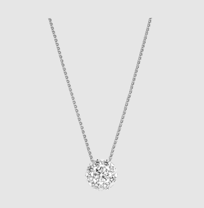 قلادة تنبض بالحب والأنوثة، تجمع بين رهافة التصميم وسخاء البريق. مصنوعة من الذهب الأبيض عيار 18 قيراط ومرصّعة بـ 2.3 قيراط من الألماس الأبيض الدائري المثبت بحواف ذهبية على شكل قلوب صغيرة. كما ان هذه القطعة تعبّر عن فلسفة شوبار التي ترى في الألماس لغةً لا تحتاج إلى ترجمة. كل تفصيلة فيها تحكي عن أنوثةٍ تحتفي بنفسها في صمتٍ فخمٍ ومهيب. السعر: 37,900$.
