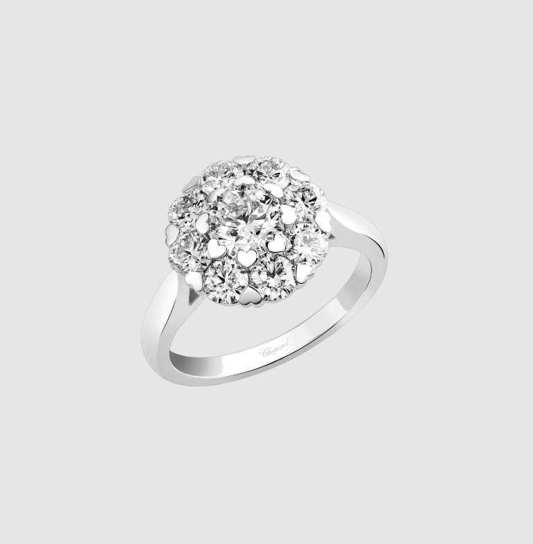 يتجسّد في هذا الخاتم المعنى الحقيقي للأناقة الهادئة، مصنوع من الذهب الأبيض عيار 18 قيراط، تتوّجه ألماسات دائرية الشكل بوزن 1.9 قيراط في انسجامٍ مثالي بين الضوء والمعدن مثبّتة بحواف ذهبية بتصميم القلوب الصغيرة. كأن كل حجرٍ فيه يهمس بسرٍّ أنثوي عن الجمال الذي لا يحتاج إلى كلمات. السعر: 23,400$.