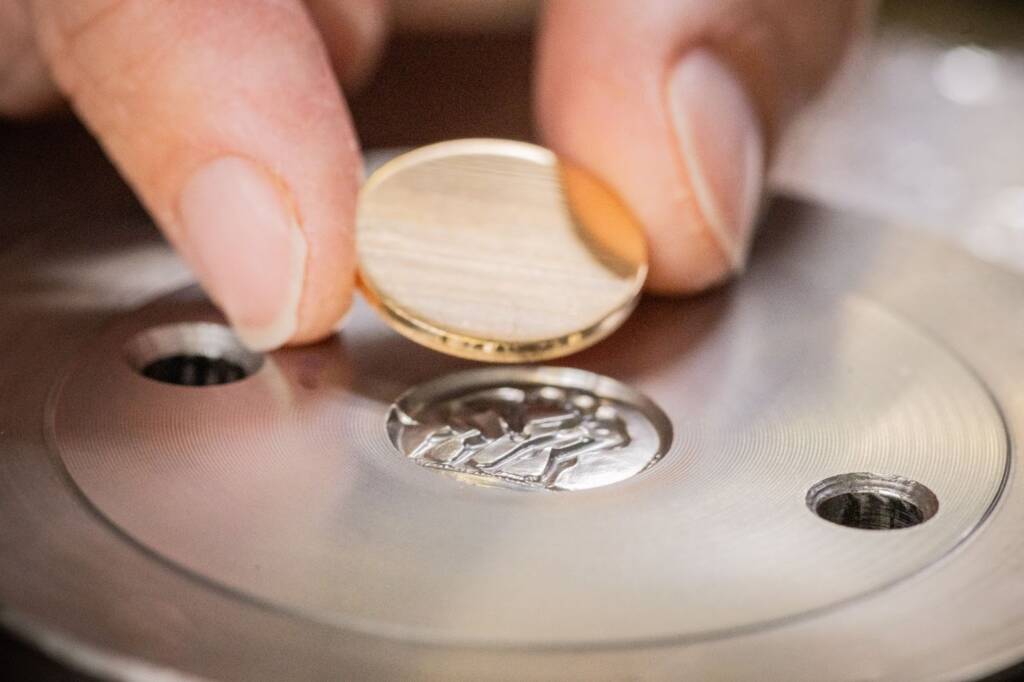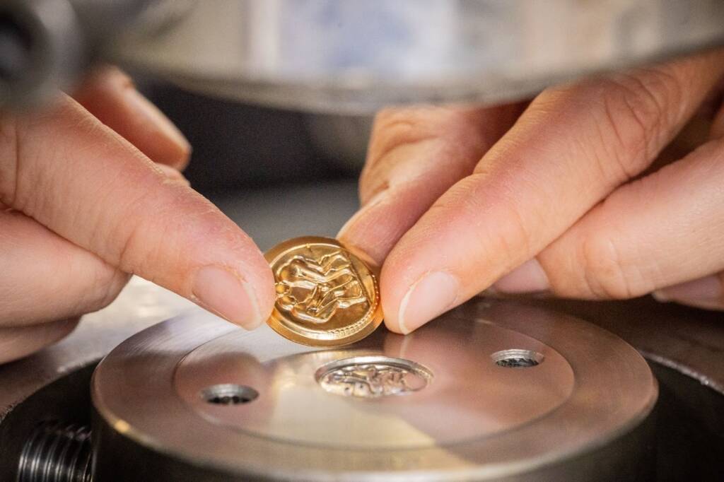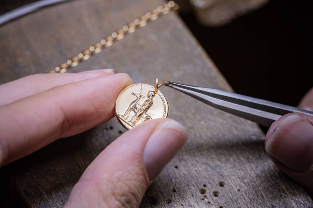 تُصنع هذه الميداليات بتقنية الختم (Stamping) العريقة، حيث يتطلّب كل تصميم ما يصل إلى ثماني ضربات للوصول إلى أدق تفاصيل النقش. بعد التشكيل، يُعاد العمل على الذهب ليكتسب طبقة Patina ناعمة، تبرز فوقها الزخارف البارزة المصقولة بلمعان قوي يمنح المعدن إشراقاً عميقاً. وتُظهر الصور المرفقة مراحل القصّ، التنعيم، التلميع، ثم تجميع السلسلة مع الميدالية، في تجسيد حي لمستوى الحرفية الذي يميّز الدار.