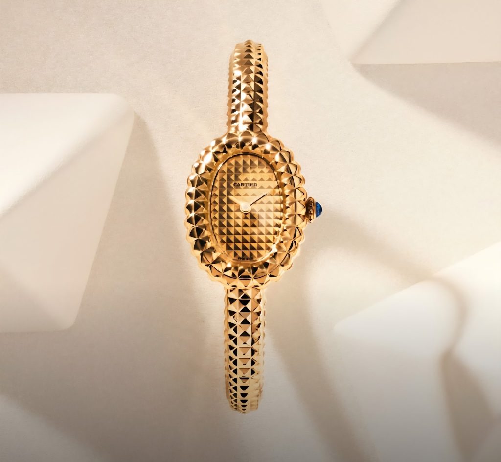 ولمحبي التصاميم الأنثوية، تعيد كارتييه تقديم ساعة Baignoire الأيقونية بشكل جديد، حيث تتحول إلى سوار ذهبي صلب يعانق المعصم برقة. ويبرز التصميم من خلال نقشة Clou de Paris التاريخية، التي تعكس إرث الدار الممتد منذ عشرينيات القرن الماضي، مؤكدة أن البساطة المدروسة هي جوهر الفخامة الحقيقية.