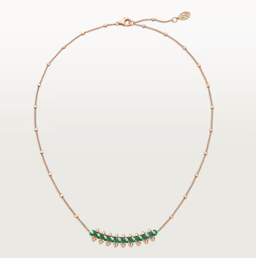 قلادة Clash de Cartier مصنوعة من ذهب وردي عيار 18 قيراط (750/1000) مع حجر عقيق مصبوغ باللون الأخضر (Green-dyed agate) في التصميم الهندسي المميز الذي يدمج بين الخرز المعدني والنقاط المربعة لإعادة تفسير تراث الدار بأسلوب معاصر، وتأتي بسلسلة قابلة للتعديل بطول 38 إلى 41 سم مع طول المعلّق حوالي 39.2 مم وعرض تقريبًا 7.9 مم؛ سعرها 5,800 دولار أمريكي.