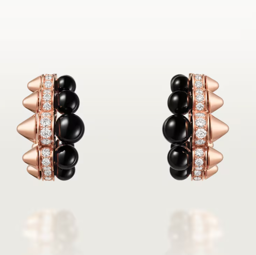 أقراط Clash de Cartier بنمط Hoop Extra-Large مصنوعة من ذهب وردي عيار 18 قيراط مع حجر عقيق أونيكس الأسود ومرصّعة بـ 90 حجر ألماس بوزن إجمالي حوالي 0.85 قيراط، وتتميز بعرض يبلغ حوالي 13.8 مم وقطر خارجي حوالي 21.8 مم في تصميم يجمع بين الجمال الهندسي والروح الجريئة لمجموعة Clash التي تعيد تفسير التراث الأسلوبي لكارتييه بتوازن بين النقوش المعدنية والألوان العميقة للحجر؛ سعرها 32,100 دولار أمريكي