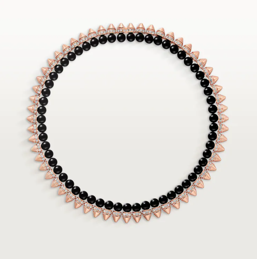 قلادة Clash de Cartier Flexible Extra-Large من كارتييه مصنوعة من ذهب وردي عيار 18 قيراط (750/1000) مدموج مع عقيق أونيكس الأسود ومرصّعة بـ حوالي 577 ماسة بقطع لامع بإجمالي وزن تقريبي 7.3 قيراط، وتتميز بعرض يبلغ حوالي 12.2 مم وطول سلسلة تقريبي 37 سم في تصميم يجمع بين الجرأة الهندسية والحركة المرنة التي تميّز مجموعة Clash؛ سعرها 99,000 دولار أمريكي.