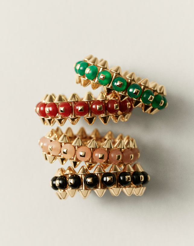 تضمّ مجموعة خواتم Clash de Cartier تشكيلة جريئة ومتناسقة يمكن ارتداؤها بأسلوب التكديس (Stacking)، حيث تأتي جميع القطع مصنوعة من ذهب وردي عيار 18 قيراط وبعرض موحّد يبلغ حوالي 7.9 مم، لتخلق انسجاماً بصرياً مثالياً عند تنسيقها معاً. تتنوّع الأحجار بين العقيق المصبوغ باللون الأخضر، عقيق الأونيكس الأسود، العقيق الأحمر المصبوغ، والكالسيدوني الوردي، في لوحة لونية تعبّر عن روح كارتييه المعاصرة التي تمزج بين الحِدّة الهندسية والنعومة الأنثوية ضمن شبكة Clash الأيقونية. يمكن ارتداء كل خاتم منفرداً لإطلالة أنيقة أو تكديسها معاً للتعبير عن شخصية جريئة ومتفرّدة؛ وتتراوح أسعار هذه الخواتم بين 5,550 و6,400 دولار أمريكي حسب نوع الحجر.