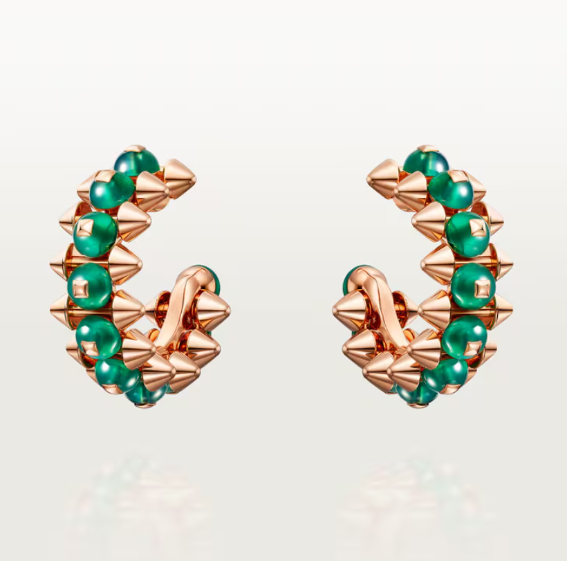 أقراط Clash de Cartier مصنوعة من ذهب وردي عيار 18 قيراط مع حجر عقيق مصبوغ باللون الأخضر (Green-dyed agate) بقطر خارجي حوالي 19.8 مم وعرض حوالي 7.9 مم، وتتميّز بتصميمها الدائري الذي يجمع بين الكودات الهندسية الجريئة لعناصر مجموعة Clash واللون الحيوي للحجر لتعزيز التأثير البصري الأنيق؛ سعرها 9,450 دولار أمريكي.