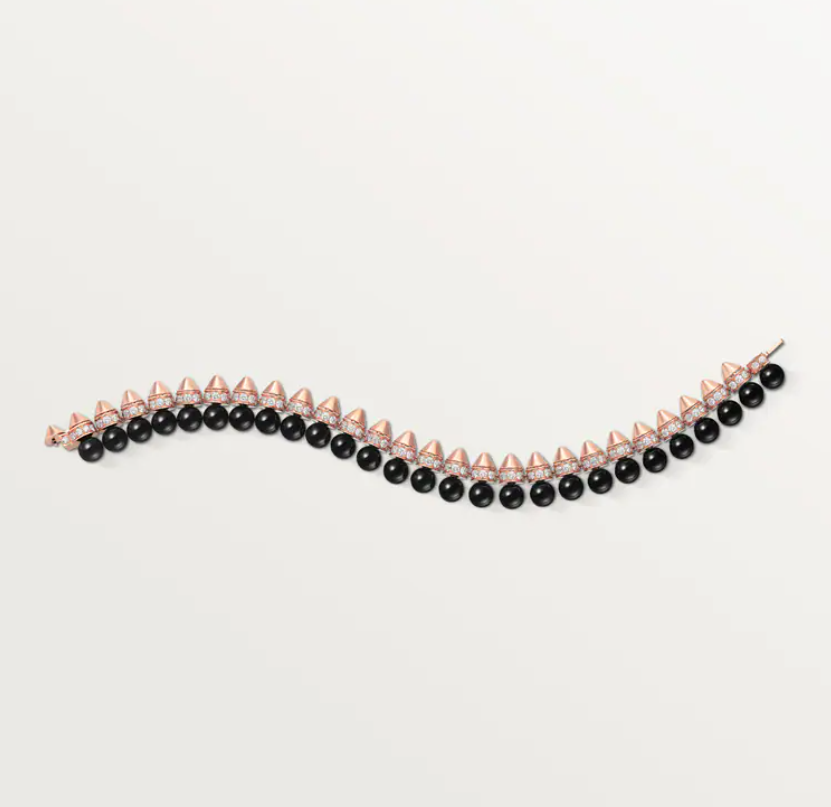 سوار Clash de Cartier من كارتييه بنمط Flexible Extra-Large مصنوع من ذهب وردي عيار 18 قيراط مع إدراج عقيق أونيكس الأسود ومُرصّع بالألماس ضمن شبكة هندسية متحركة تبرز رموز تصميم المجموعة الجريئة والمميزة؛ سعره 49,500 دولار أمريكي.