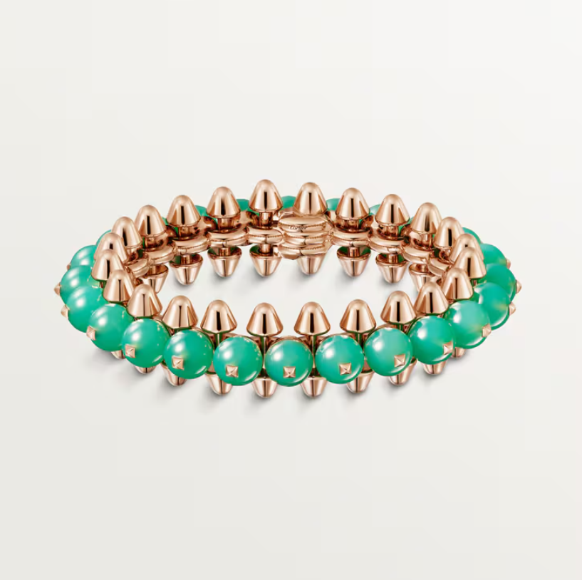 سوار Clash de Cartier بنمط Extra-Large مصنوع من ذهب وردي عيار 18 قيراط مع حجر كريسوبراز (Chrysoprase) الأخضر الجميل ويتميّز بتصميم قوي هندسي ضمن شبكة Clash التي تدمج بين العناصر المعدنية المتداخلة واللمسة العصرية للحجر ليشكل قطعة فاخرة وبارزة في الإطلالة؛ سعره 74,500 دولار أمريكي.