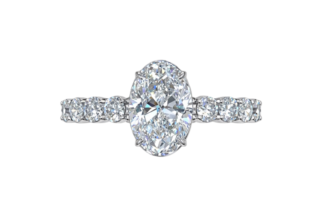 يتوسّط الخاتم حجر ألماس بقطع Oval Cut، بلون D Colourless (عديم اللون تماماً) ونقاوة Flawless Clarity، وهي من أعلى درجات التصنيف العالمي. تحيط به أحجار جانبية بقطع Round Brilliant وفق المعايير الأوروبية، ليصل الوزن الإجمالي للألماس إلى 4.56 قيراط، موزعة بين الحجر المركزي وأحجار الـPavé الجانبية، مع تناغم دقيق في اللون والبريق. الخاتم حاصل على شهادة GIA، وممهور ومختوم من غرفة التجارة الإسبانية، ومُقيَّم من جمعية المجوهرات الإسبانية بأكثر من 145,000 يورو، أي ما يعادل نحو 172,000 دولار أمريكي.