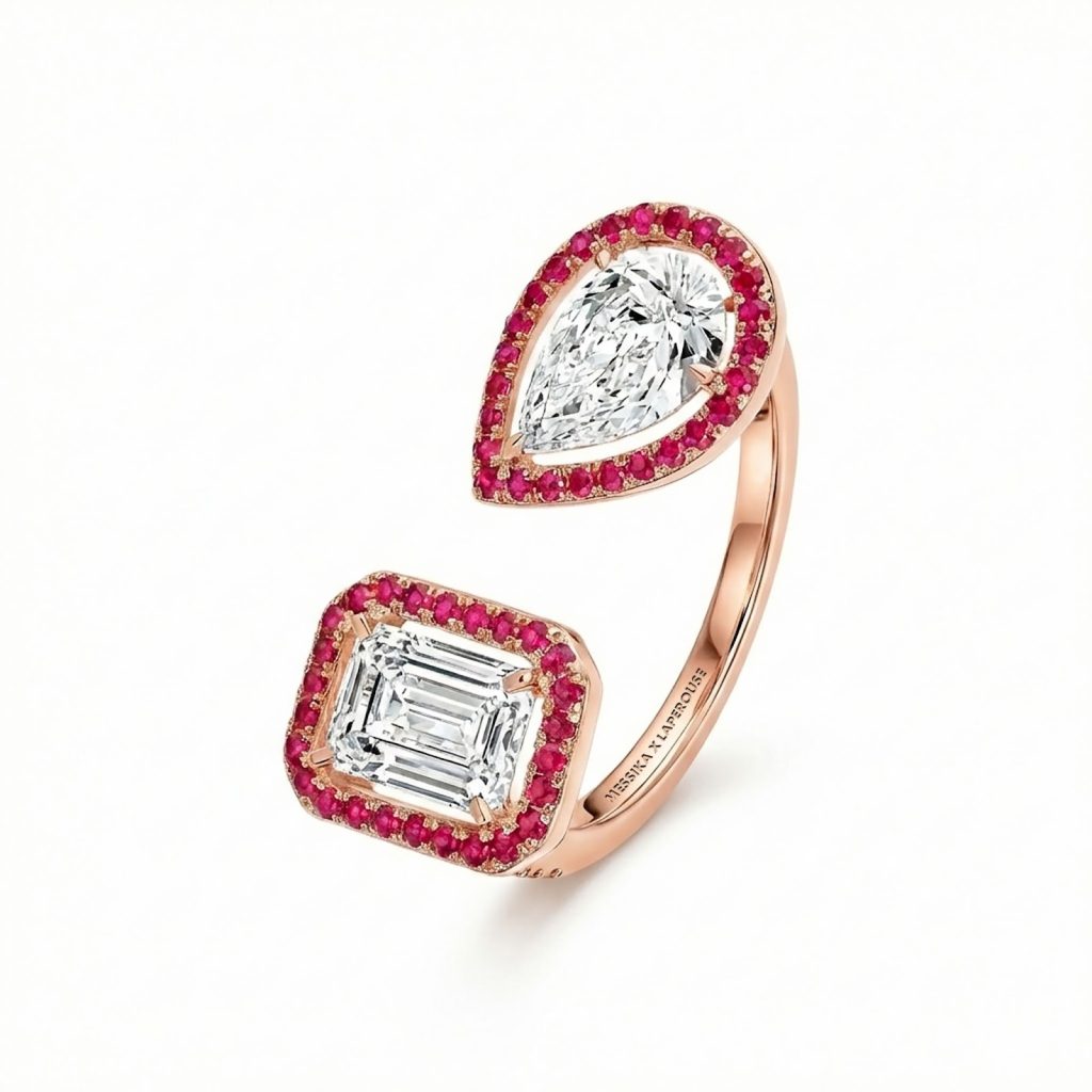 كشفت ميسيكا عن إصدارٍ خاص من تصميم My Twin الأيقوني، مصنوع من الذهب الوردي، ويجمع حجرين من الألماس يزن كلّ منهما 0.60 قيراط: أحدهما بقطع الكمثرى، والآخر بقطع الزمرد، موضوعين وجهاً لوجه في تناغم عصري يجسّد مفهوم “Toi & Moi”. يستمد الخاتم رومانسيته من التقاء شكلين متناقضين يتكاملان في انسجامٍ بصري لافت، تحيط بكل حجر هالة من الياقوت الأحمر، في تباينٍ لوني جريء يعكس قوة الحب وعمقه. ويحمل الخاتم نقشاً خاصاً Messika x Lapérouse ليُخلّد هذه الشراكة الفريدة بالألماس والذهب.