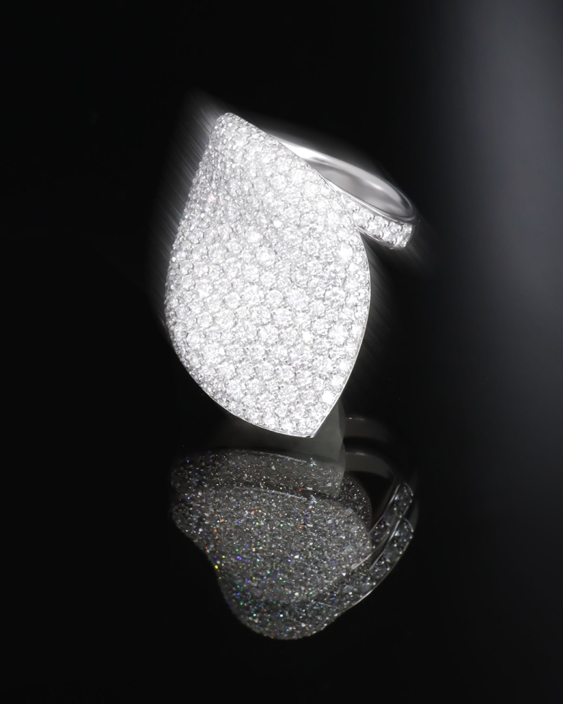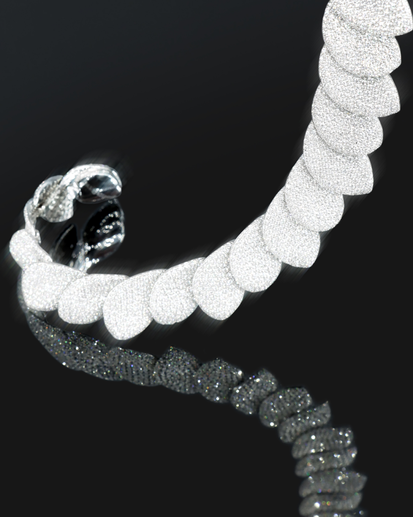 في قلب المجموعة، تتجلّى القطع النحتية متعددة الاستخدامات كعناصر بطولية لافتة. خاتم Aleluiá المصنوع من الذهب الأبيض عيار 18 قيراطاً والمرصّع بالألماس الأبيض، يتوافر بتصميم الورقة الواحدة، أو الورقتين، أو بتكوينٍ درامي من ثماني أوراق متراكبة. يمكن ارتداؤه منفرداً أو بتنسيق التكديس، ليعكس حركة الطبيعة الرقيقة وقوة التكرار، وهي رمزية تتناغم بعمق مع إيقاع رمضان، حيث تتكرر الطقوس اليومية لتكتسب بعداً روحياً متجدداً.
