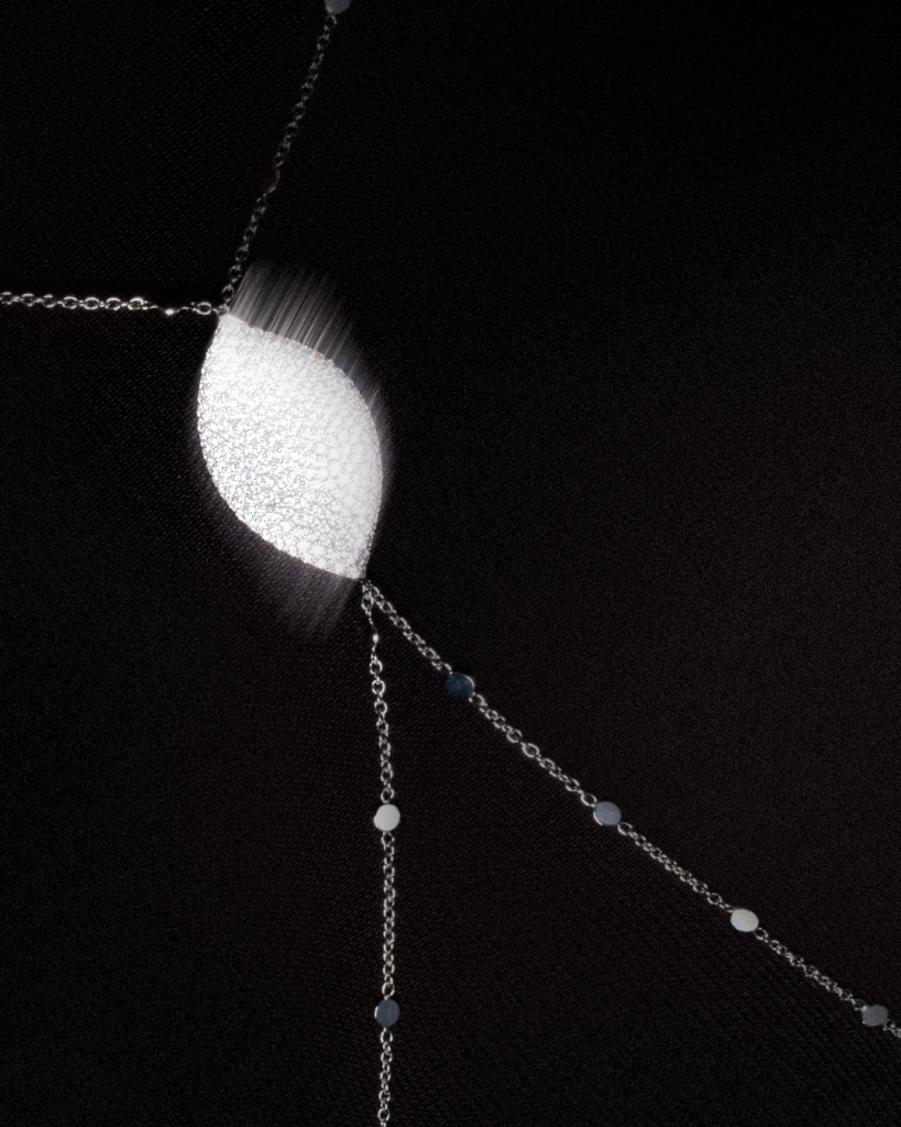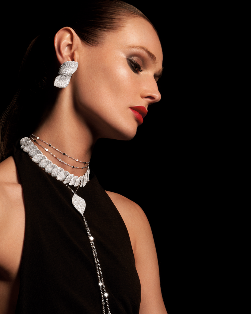 أمّا أقراط Aleluiá المصنوعة من الذهب الأبيض عيار 18 قيراطاً والمرصعة بالألماس الأبيض، فتتبع انحناءات الأذن بخفة وأناقة، فيما يمنح عقد Aleluiá Sautoir إمكانات تنسيق لا محدودة. يمكن ارتداؤه كعقد كلاسيكي، أو كزينة للجسد، أو بطبقات متعددة تضفي إشراقة ناعمة على إطلالات رمضان والعيد.