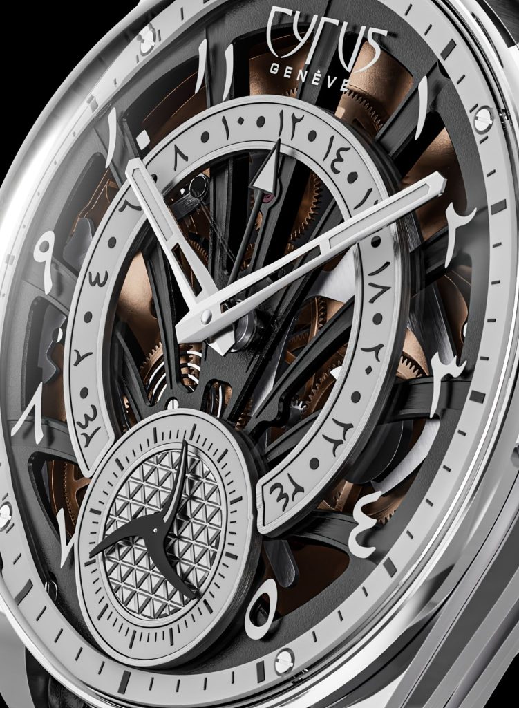 منذ اللحظة الأولى، يأسرك الميناء بتعقيداته وانتظامه، كأنك أمام مشهد معماري صغير يكشف طبقاته بهدوء. الطبقة الأولى تأتي من الصفيحة الأساسية ذات المعالجة بالذهب الأحمر 5N، التي تبعث دفئاً خفيفاً يشبه وهج شمس تُلامس الأفق. وفوقها ينتصب الجسر العلوي المصاغ على شكل نخلة، رمز الأرض العربية ونبضها، وقد أُتقن تشكيله بتشطيبات دقيقة تجمع بين السَّحج والتعتيم والحواف اللامعة التي تخطف الضوء وتعيد توجيهه. وتكتمل هذه الروح بقرص سافيري شفاف يحمل مؤشرات عربية مضيئة تتوهّج بالأزرق ليلاً، فتمنح الساعة هوية ثقافية واضحة ومترفة في آن. أما الدقائق والثواني وحلقة التوقيت الثاني GMT بتقسيم 24 ساعة، فتتوزع جميعها بتناغم بصري يستلهم الخط العربي وانسيابه. وعند السادسة، تظهر تلك اللمسة المميّزة من Cyrus Genève: نقش مثلثي أنيق يشبه توقيعاً بصرياً صغيراً، يتجاور مع عقرب الثواني المصمّم على هيئة شعار الدار.