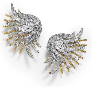 افتتحت ليدي غاغا المشهد بإطلالة لافتة ارتكزت على أقراط فاخرة من تيفاني آند كو، جاءت بتصميم مستوحى من أجنحة الطيور، مرصعة بأكثر من 6 قراريط من الألماس، ومصنوعة من البلاتين والذهب الأصفر عيار 18 قيراط، في توليفة تعكس توازنًا دقيقًا بين القوة والأنوثة.