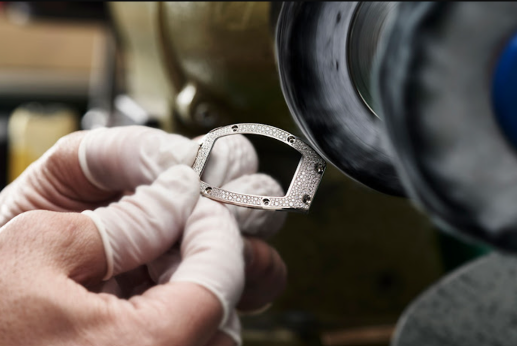 تعتمد RM 07-01 Snow Setting على واحدة من أدق تقنيات الترصيع في عالم الساعات، وهي تقنية الترصيع الثلجي (Snow Setting). تقوم هذه التقنية على توزيع الأحجار الكريمة بطريقة تبدو عشوائية للوهلة الأولى، لكنها في الواقع مدروسة بعناية فائقة لتوليد تأثير بصري يحاكي ومضات رقاقات الثلج تحت أشعة الشمس.