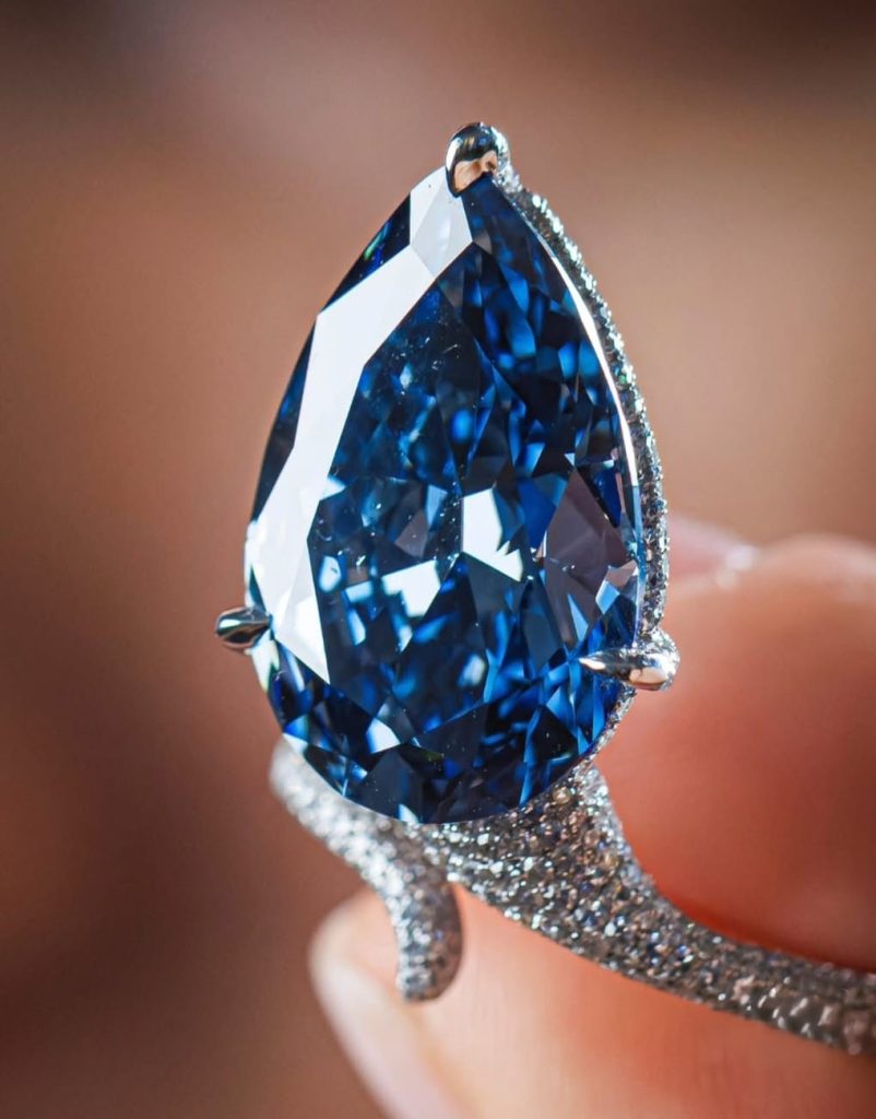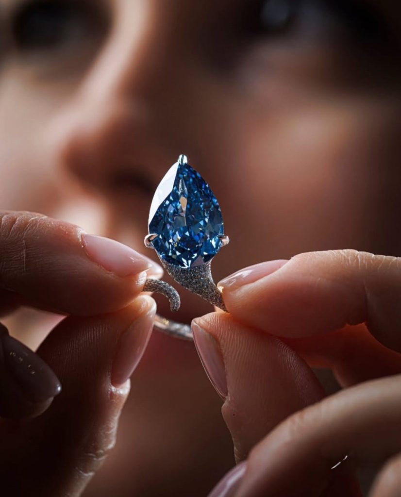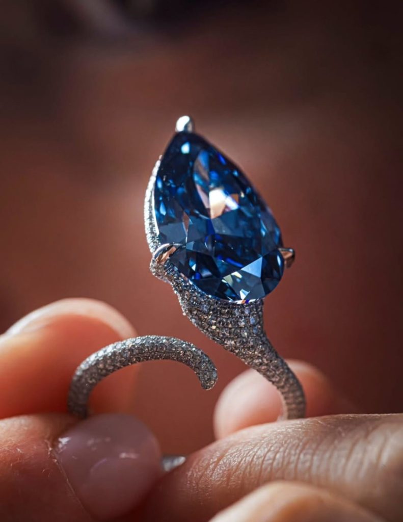 أمّا تصميم الخاتم الذي يحتضن الحجر، فهو تحفة أخرى بحد ذاته. خاتم بتصميم Serpentine متعرّج، يلتف حول الإصبع كأنه ينساب بحركة مائية ناعمة، يكمّل لون الألماسة الأزرق ويُبرز وهجها الداخلي، فيجمع بين قوة الخطوط ورهافة الانسياب. وهكذا، تحوّلت الألماسة من مجرد حجر باهظ الثمن، إلى قصة فنّية، وإلى لوحة من الضوء، وإلى كنز يختصر الجمال في أنقى صوره.