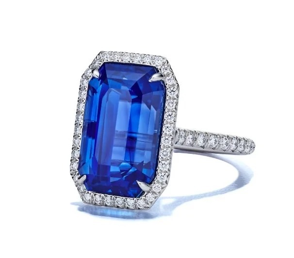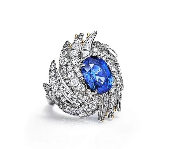 الثاني خاتم من البلاتين مرصّع بياقوت أزرق غير معالج يزيد وزنه عن 10 قراريط مع الألماس، لتأتي المجوهرات متناغمة مع ثيمة اللون الأزرق التي سيطرت على الإطلالة بالكامل.
